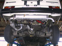 Flexrohr direkt an den Flansch anschweissen, U-Rohr an das Flexrohr anschweissen, in das gerade Stück den Kat einschweissen und mit dem Enttopf verschrauben. Das ganze läßt sich am besten machen, wenn der Motor auf einer Palette liegt und zwar so, wie später im Bus festgeschraubt wird, außerdem ist es sinnvoll, wenn der Endtopf schon halbwegs an den Halterungen fest ist, damit man besser abschätzen kann, ob alles passt. (siehe Bild) Aufpassen, daß man nicht mit der Antriebswelle in Gehege kommt und bedenken, daß vielleicht die Motorschutzwanne wieder montiert werden soll.